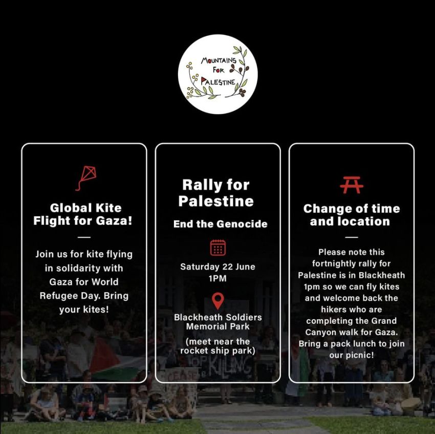 Join us at Blackheath Soldiers Memorial Park (near the rocketship!). Please bring a kite to fly as we are participating in the global kite flight for Gaza as part of World Refugee Day! We’ll also be welcoming back the hikers