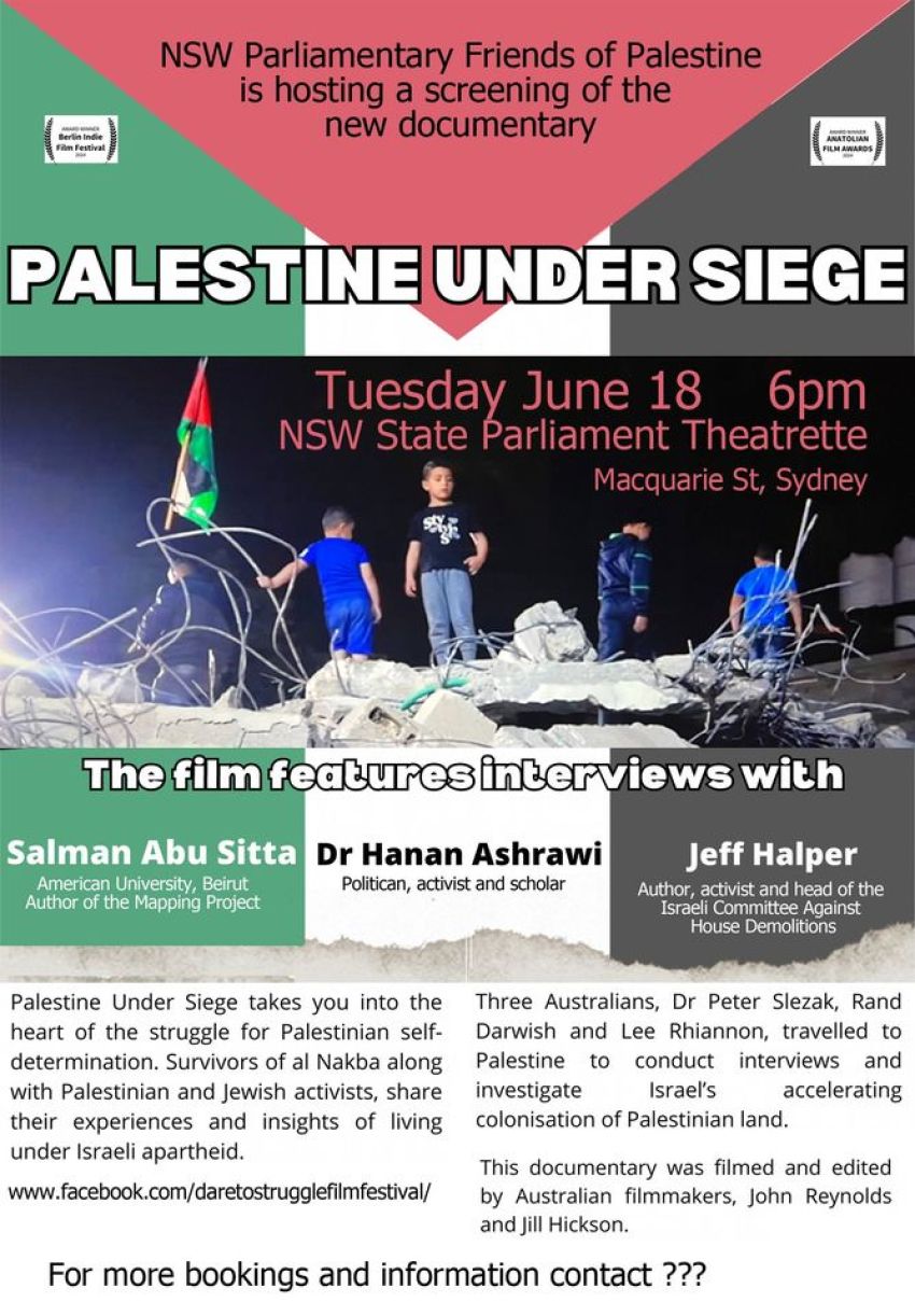 Hosted by the NSW Parliamentary Friends of Palestine, the international award winning film, Palestine Under Siege followed by a Q&A with the participants and filmmakers.