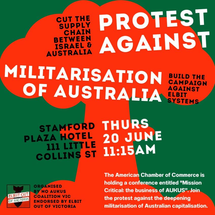 Join the protest against the deepening militarization of Australian capitalisation. Cut the supply chain between Israel and Australia. Build the campaign against Elbit Systems.