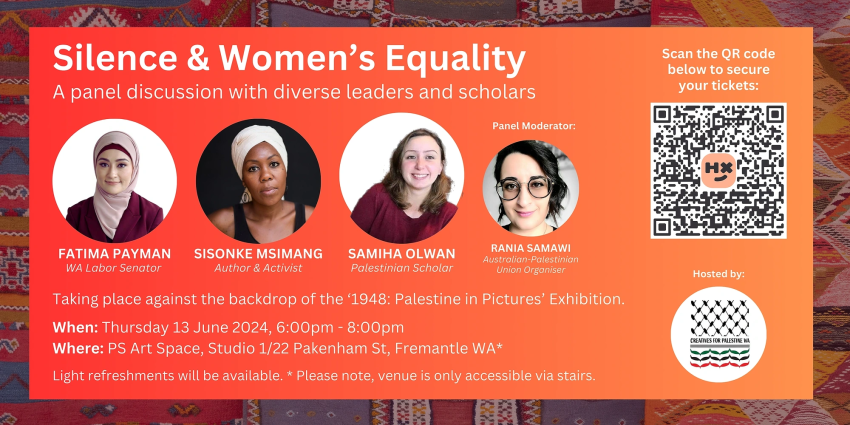 Join powerful diverse women of WA, Senator Fatima Payman, Palestinian Scholar Sameha Olwan, and human rights activist and writer Sisonke Msimang on a panel discussion to explore the role of silence on women’s equality, with a focus on intersectionality in the current moment.
