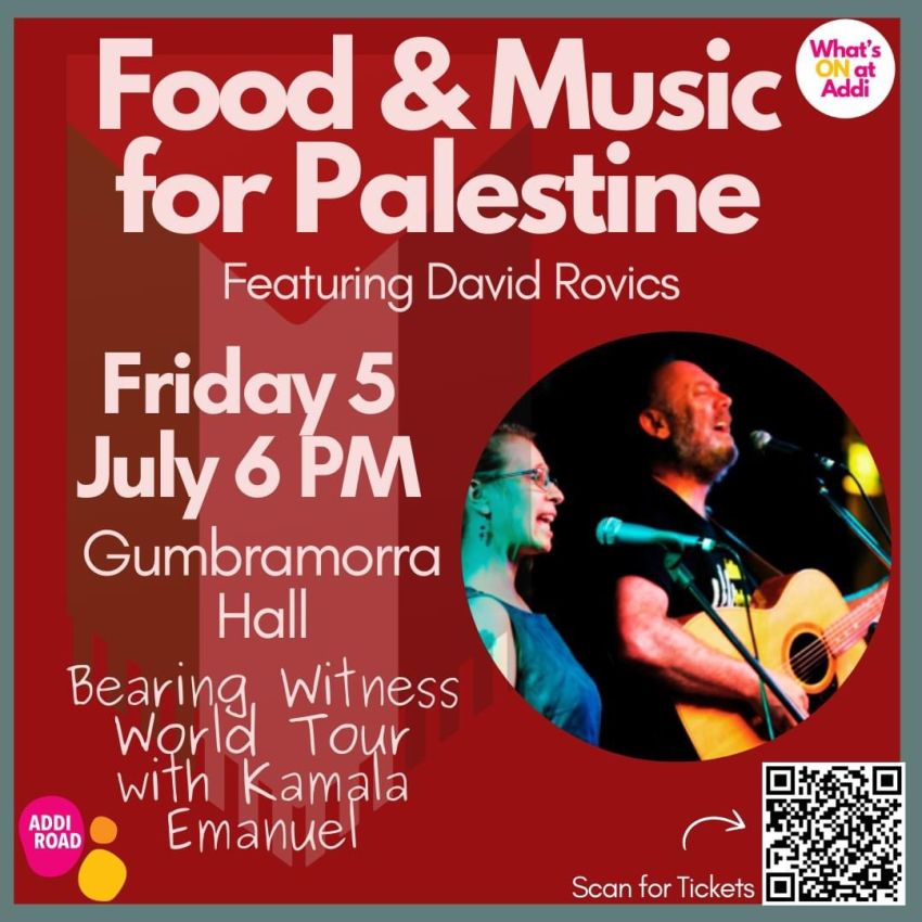 Food and Music for Palestine featuring special guests, American musician and activist David Rovics with Kamala Emanuel. There will also be a welcome dinner for the newly arrived Gazans in Sydney (who have fled the genocide in Gaza) and we invite you all to join.