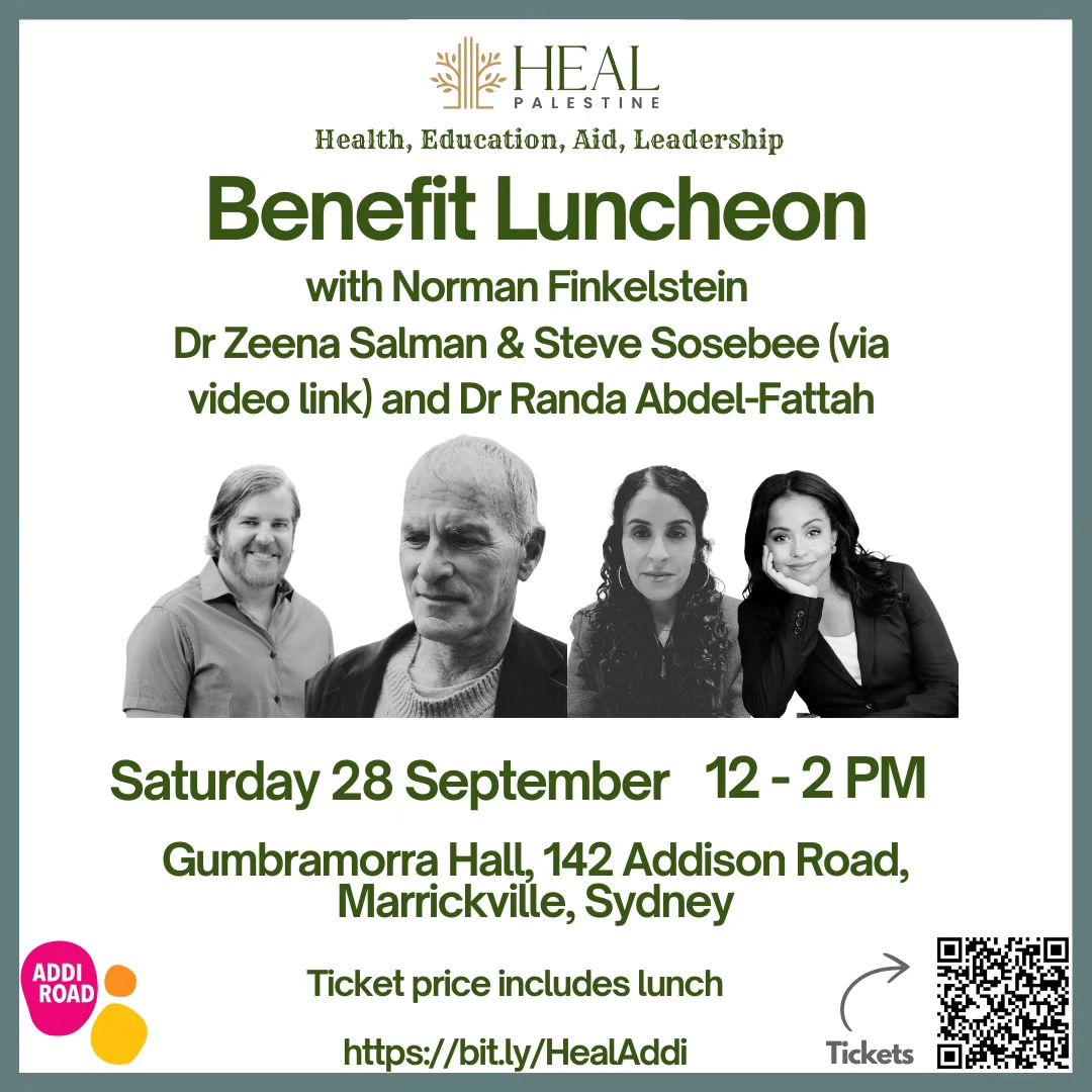 Join us for an important event with HEAL Palestine: Benefit Luncheon for Palestine featuring Professor Norman Finkelstein, Steve Sosebee, Dr Zeena Salman (via video link) and Dr Randa Abdel-Fattah.