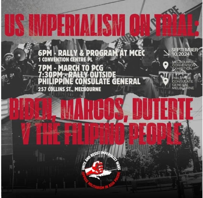 US Imperialism on trial! Join the proceedings as a witness or simply as a court observer in the war crimes trial of the millenium. Presided over by the humans of Anak Bayan, US Imperialism will be held accountable for decades of exploitation and bloody coups in the global south. Expert witnesses from impacted territories such as Indonesia, East Timor, West Papua and the Philippines, will give testimony about the US regime’s brutal crimes. The trial will run at the Convention Centre from 6pm. A march to the Philippines Consulate will follow.