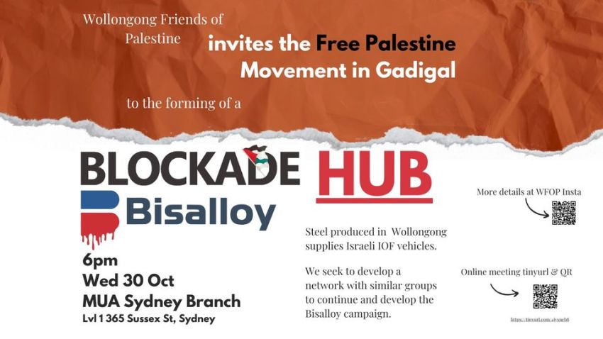 This meeting aims to introduce Bisalloy to our Sydney-based comrades, explain why it has become a focus for Wollongong Friends of Palestine, and to facilitate the formation of a self-organised group in Gadigal and elsewhere that might support the organisation of pickets and other actions aimed at halting Bisalloy's support of the Zionist entity.