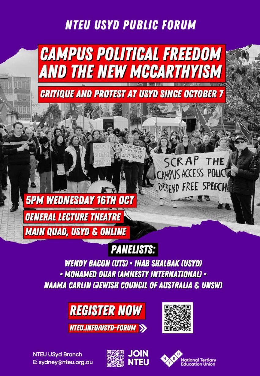 Basic democratic rights have been dangerously restricted at the University of Sydney since October 7 last year. Organised by the National Tertiary Education, this public forum will discuss the McCarthyist regime that university authorities are imposing on staff and students, and its consequences for academic freedom, freedom of assembly, and political freedom in general.