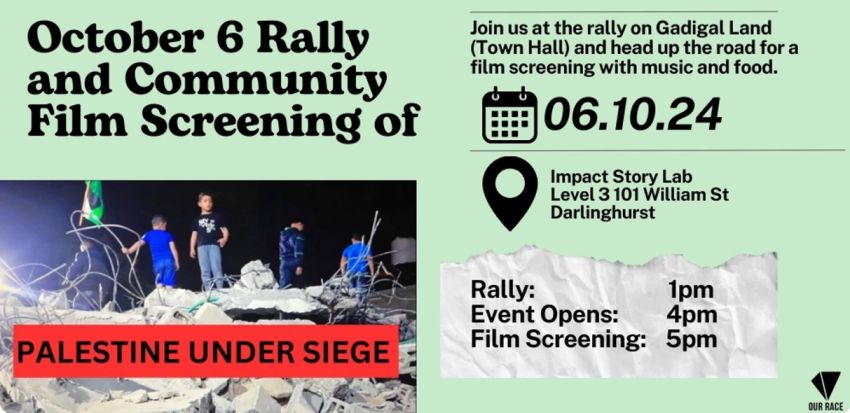 The main aim of this event is to encourage as many people as possible to attend the October 6th rally across australia and for those who will be attending the rally on Gadigal Land, you can continue with a group of us for community screening of Palestine Under Siege, music and sharing a meal.
