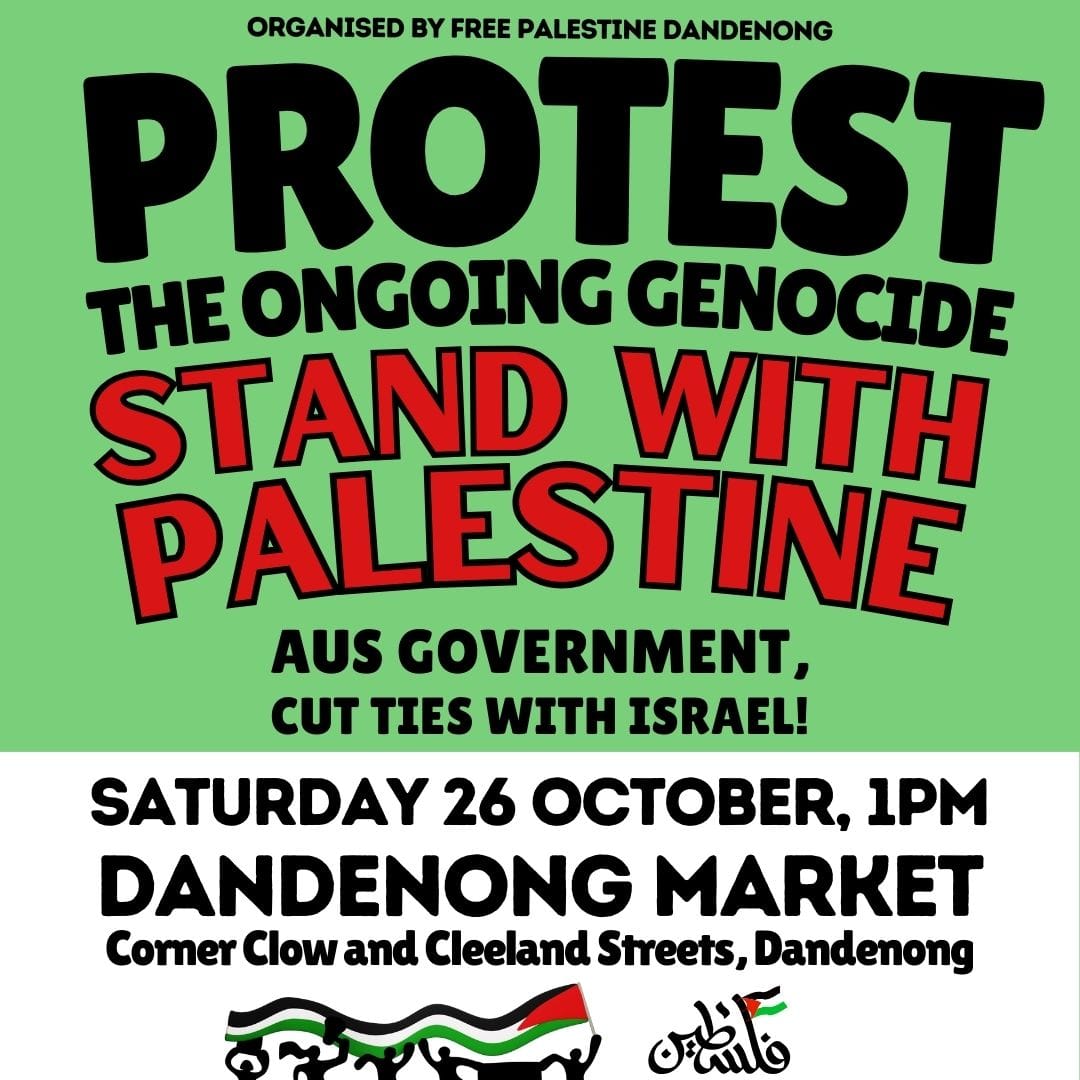 Save the date for our next protest in Dandenong, demanding the Australian government to cut ties with Israel, stop sending arms and end the occupation now.