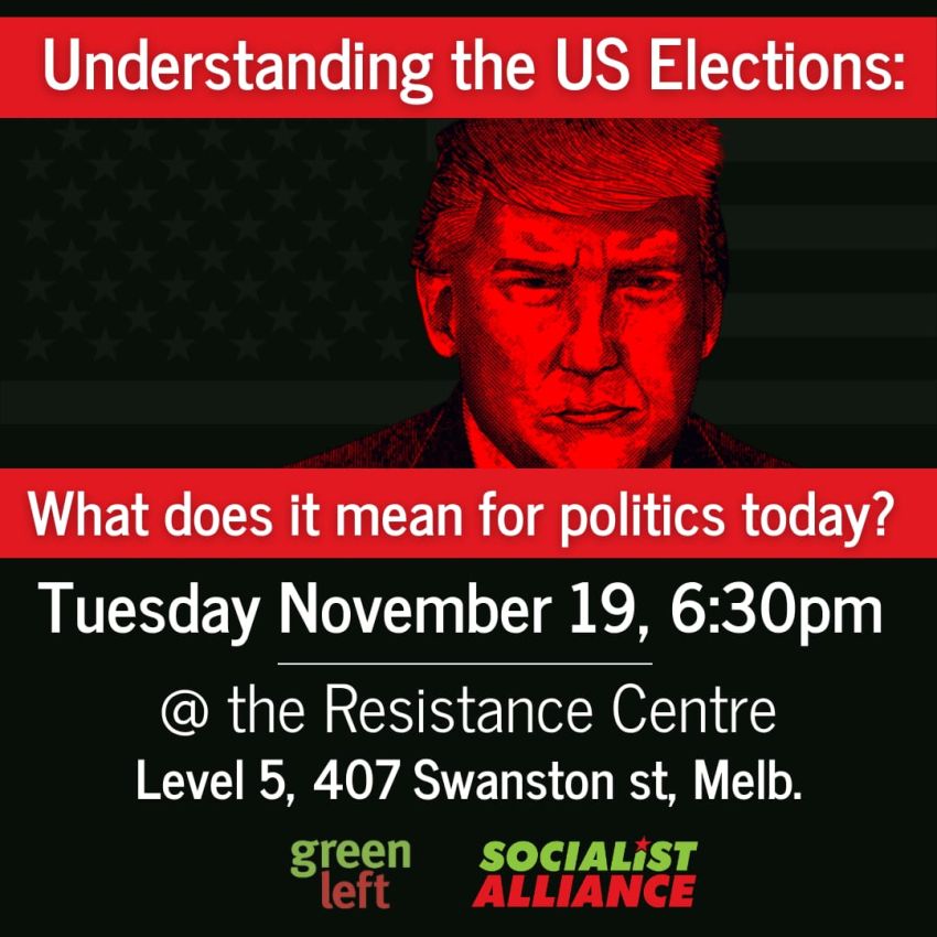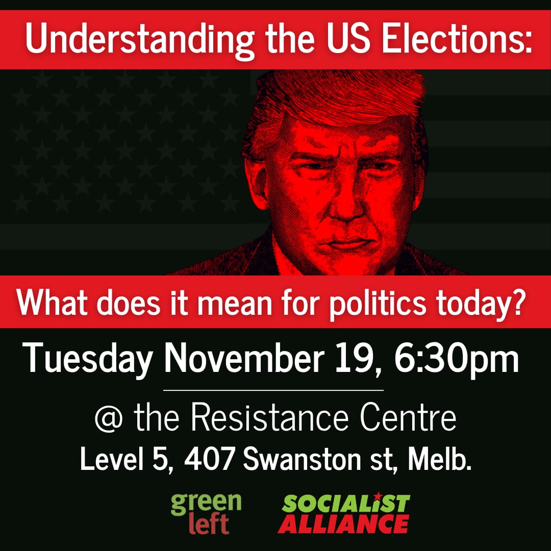 Join Socialist Alliance and Green Left for a left response to the US Election results and how we can resist growth of the right and build a left-wing alternative to the failures of liberal capitalist politics.