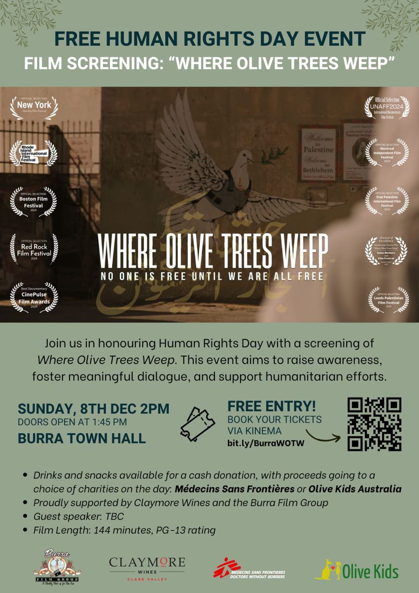 The Burra Film Group is proud to present a special screening of "Where Olive Trees Weep". This multi-award-winning documentary filmed in 2022 in the West Bank follows Palestinian journalist Ashira Darwish, activist Ahed Tamimi, and Israeli journalist Amira Hass, while also documenting Dr. Gabor Maté’s work with Palestinian women, helping them process trauma from their torture in Israeli prisons.