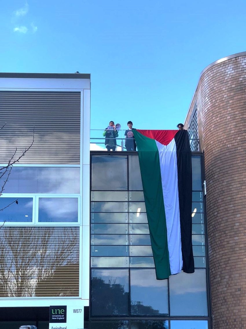 Armidale Friends of Palestine and the community protested Israel’s war on Gaza by unfurling a six-metre flag on the University of New England (UNE) campus on May 26.