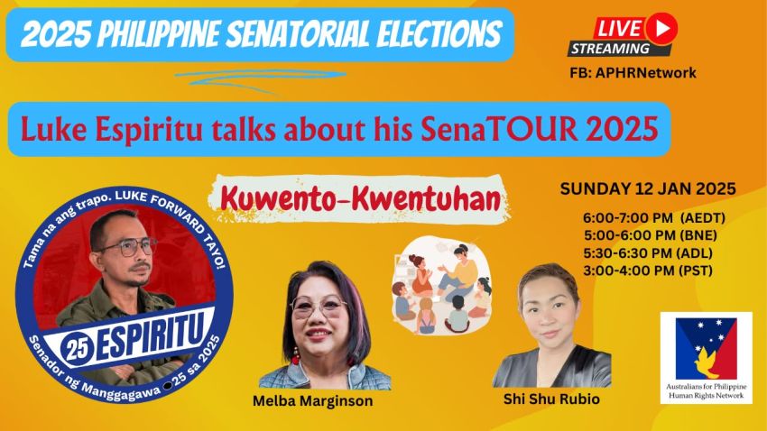 KUWENTO-KUWENTUHAN, the fortnightly vlog of Australians for Philippine Human Rights Network will guest senatorial candidate Luke Espiritu on January 12, 2025. Buoyed by his increasing standing on survey polls conducted amongst Filipino youth and students, Luke will talk about his current campaign strategy of touring the country from Ilokos to Davao. Luke will campaign in areas that his Filipino-Australian connections have strong networks, a strategy that will prove the value of overseas Filipinos in the coming 2025 elections. Watch and participate by watching the livestream on the APHRN FB page. Like the page and comment. Please note the time zone differences of your location. For more information please email info.aphrn@gmail.com.