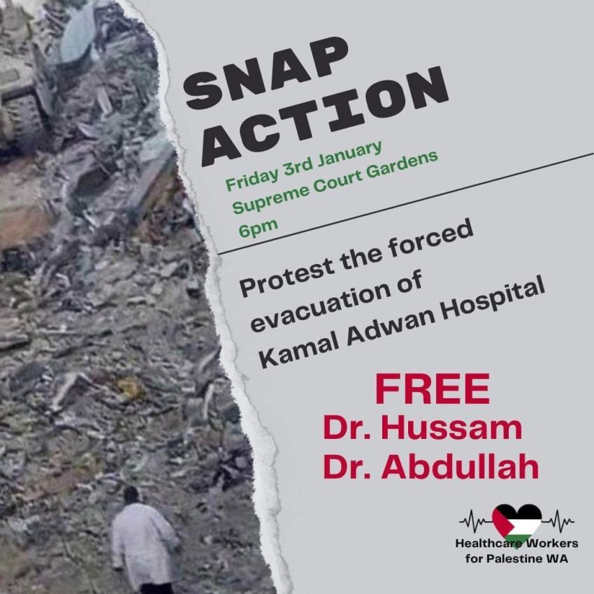 Join us as we march from the Supreme Court Gardens, past the US consulate and on to Royal Perth Hospital to demand the release of all healthcare workers including Dr Hussam and an end to the genocide