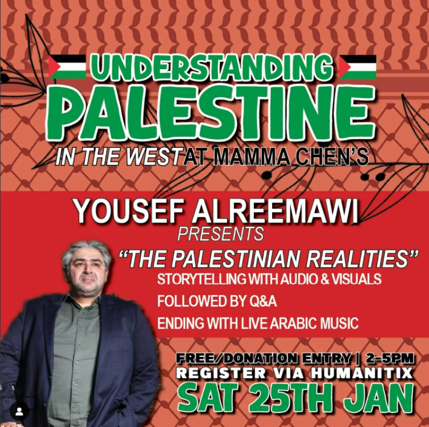 The first of our monthly 2025 events at Mamma Chen's to learn about Palestine! This first session will explore the topic "THE PALESTINIAN REALITIES" by Yousef Alreemawi from Averroes Centre of Arab Culture.