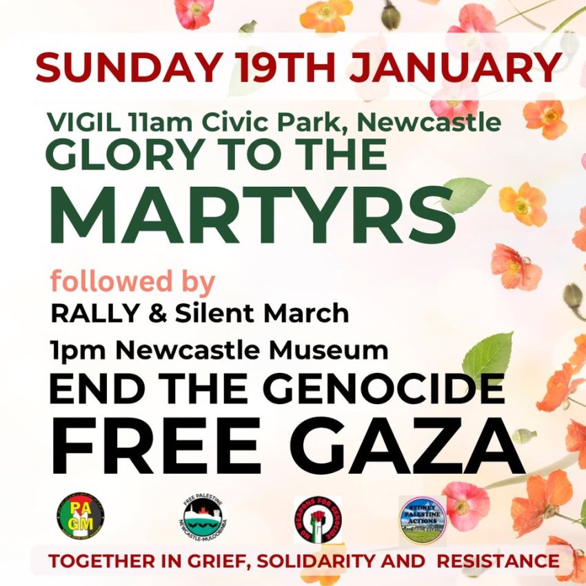 1. Event 1 , 11am Civic Park, Newcastle. Vigil where we will open and observe banners that list the names of Palestinian martyrs. Please bring flowers, leaves, bark, etc. to symbolize an offering. We will also share some thoughts, words, and poetry.