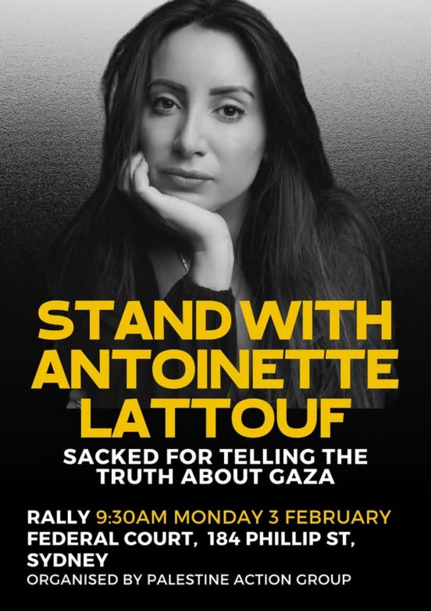 Rally to support Antoinette Lattouf, sacked by the ABC for telling the truth about Gaza, as her case is heard in the Federal Court.