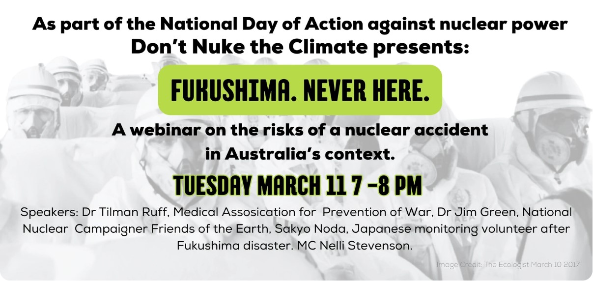 On Tuesday March 11, as part of the National Day of Action against nuclear power, Don't Nuke the Climate invites you to a webinar on the risks and implications if a nuclear accident was to occur here and the implications in the Australian context.