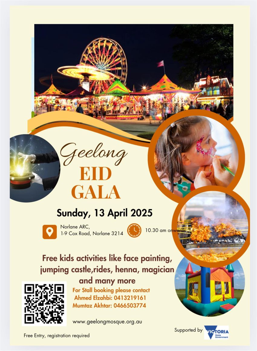 The Geelong Eid Gala is a fun-filled event where you can enjoy delicious food, free henna tattoo, face painting, trickster and many more exciting activities. Whether you're celebrating Eid or just looking for a good time, this event is perfect for everyone. Don't miss out on this opportunity to come together with friends and family to celebrate this special occasion.