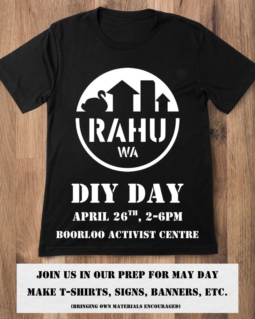 RAHU WA DIY day. Join us as we do a bunch of crafts and DIY some RAHU t-shirts. All are welcome. We are making a bunch of stuff for our May Day stall and the march.