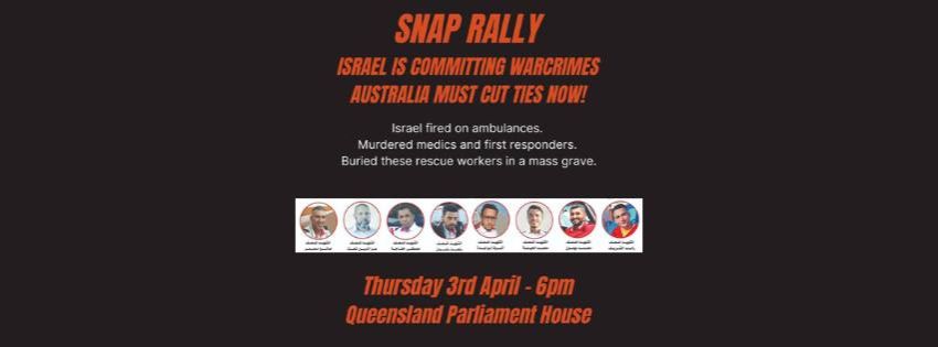 JFP is calling for a snap rally tomorrow 03APR’25 at 6pm in front of Queensland’s Parliament to protest Israel’s massacre of paramedics and rescue workers, and demand from the QLD government to cut ties with Israel including the weapons manufacturing in Queensland.