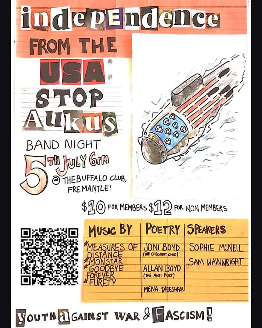 An evening of good music and poetry at the Fremantle Buffalo Club to say Stop AUKUS . Don't die for the USA! Get tickets here.