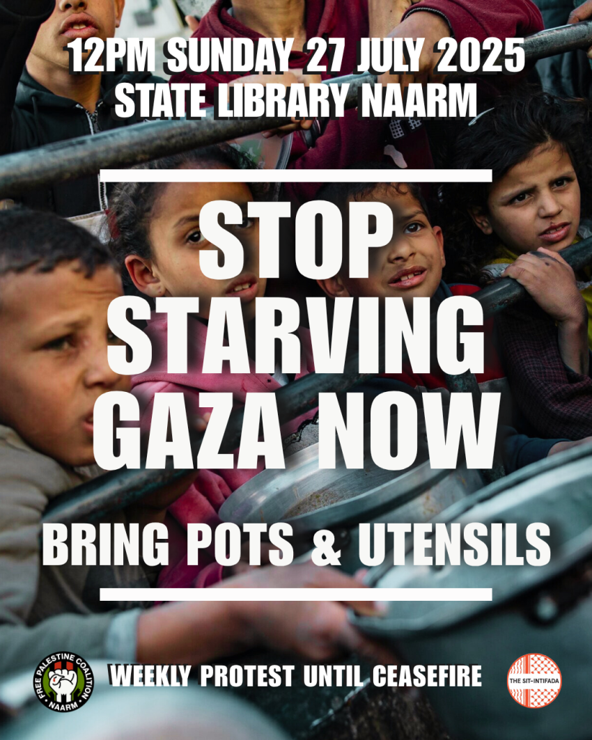 PROTEST THIS SUNDAY 27 JULY 2025 @ 12PM STATE LIBRARY - STOP STARVING GAZA NOW - BRING POTS + UTENSILS