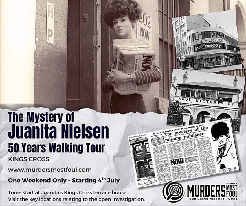 Explore the dark side of Sydney’s Kings Cross with crime historian Elliot Lindsay as we commemorate the 50th year of Juanita Nielsen’s mysterious disappearance. This tour will take you through the key locations tied to her life, activism, and the events that led up to her vanishing on July 4, 1975, and beyond. Step into the world of 1970s Kings Cross, where corruption, greed, and the underworld thrived, and Juanita’s fight against powerful forces cost her dearly.