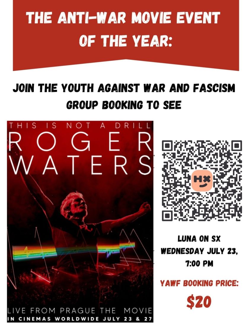 Come along to the anti-war movie event of the year. Join with Youth Against War and Fascism in see the film of Roger Waters Prague concert, recorded last year. The THIS IS NOT A DRILL tour may be Waters farewell to live performance. Rogers said that his concert was “a statement in opposition to fascism, injustice, and bigotry in all its forms.” Various German city governments attempted to ban it. THIS IS NOT A DRILL is a work of cultural rebellion. Be part of it!
