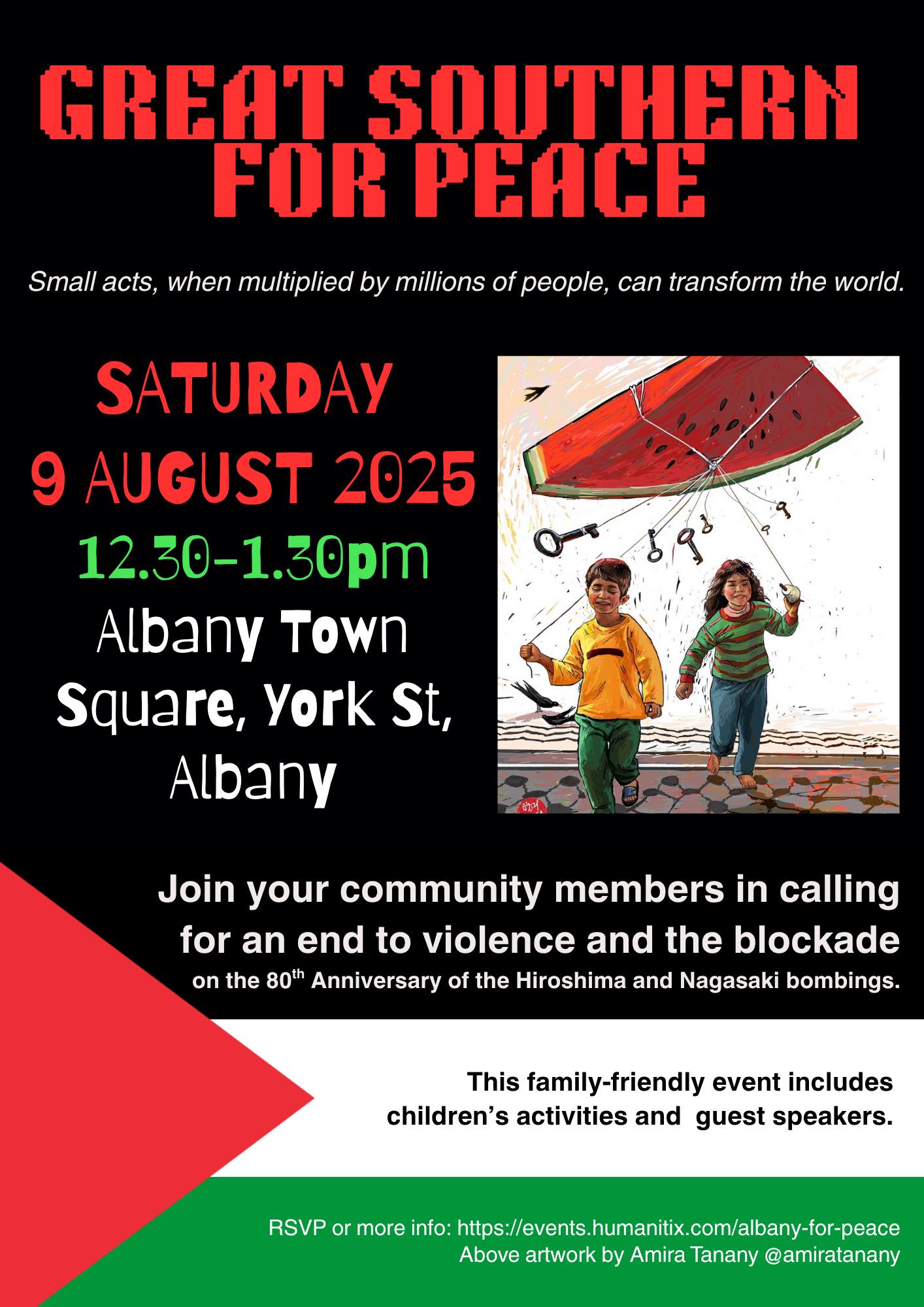 Join your community members in calling for an end to the blockade and genocide of Palestinians, on the 80th Anniversary of the Hiroshima and Nagasaki bombings. We invite you to join us in calling for solutions to bring about peace in our world. Guest Speakers and Children's Activities. This will be a family-friendly peaceful event. Going ahead rain or shine, bring an umbrella!