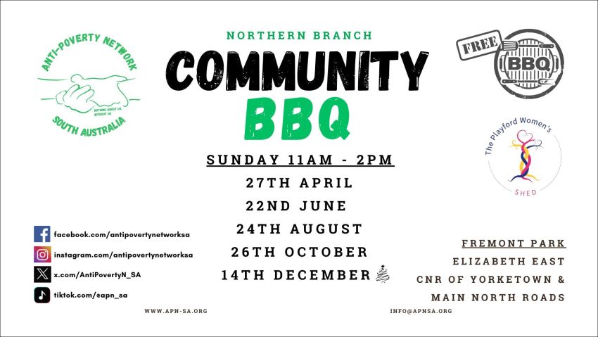 Anti-Poverty Network SA is a volunteer-run community advocacy group, made-up of job-seekers, pensioners, carers, students, sole parents, and allies, advocating for dignity and justice for all low-income people. We are often joined at the BBQ's by other organisation and are supported by the Playford Women's Shed.