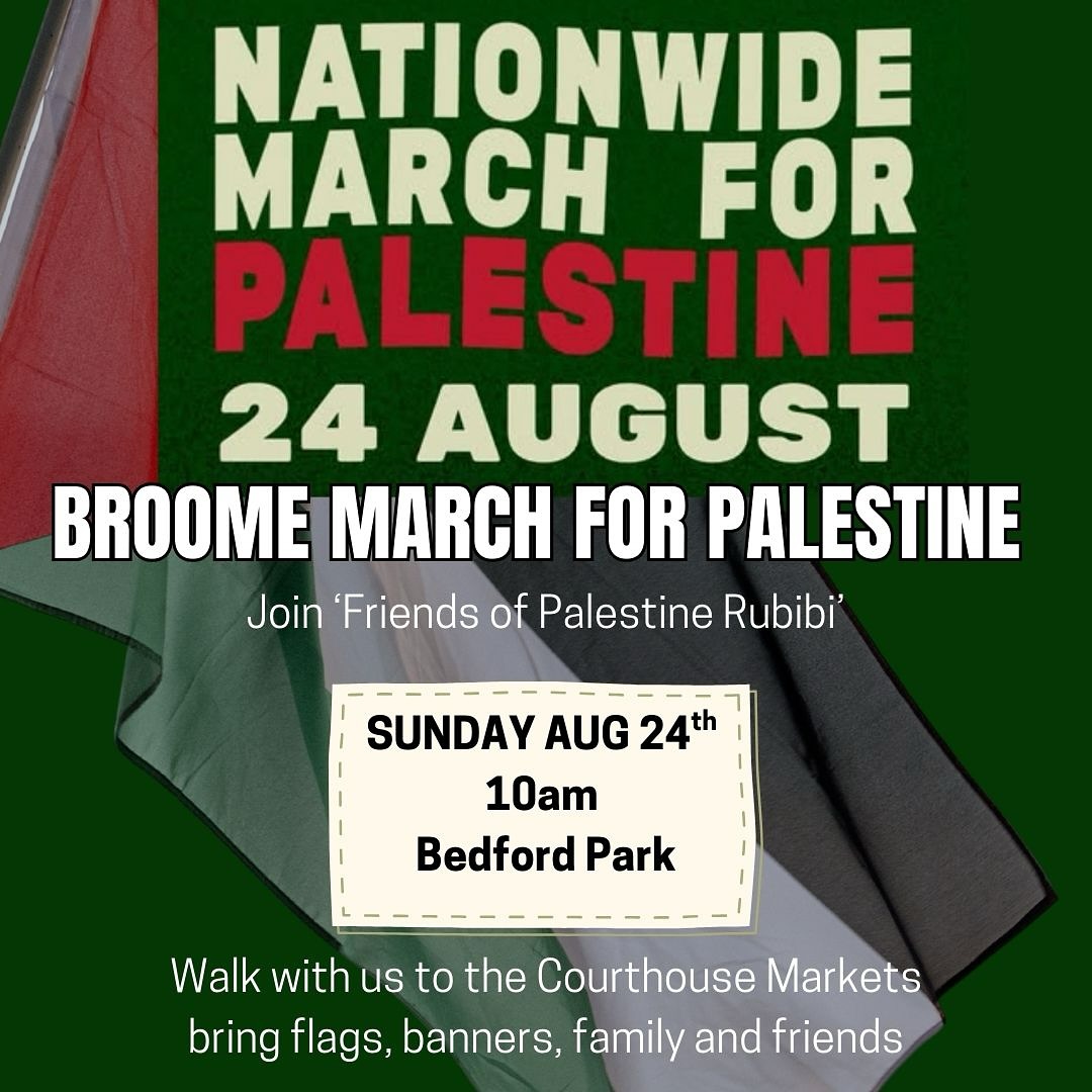 Rubibi/Broome friends of Palestine- please join us this Sunday morning, the 24th August at 10am as we walk from Bedford Park down to the markets in solidarity with the people of Palestine.