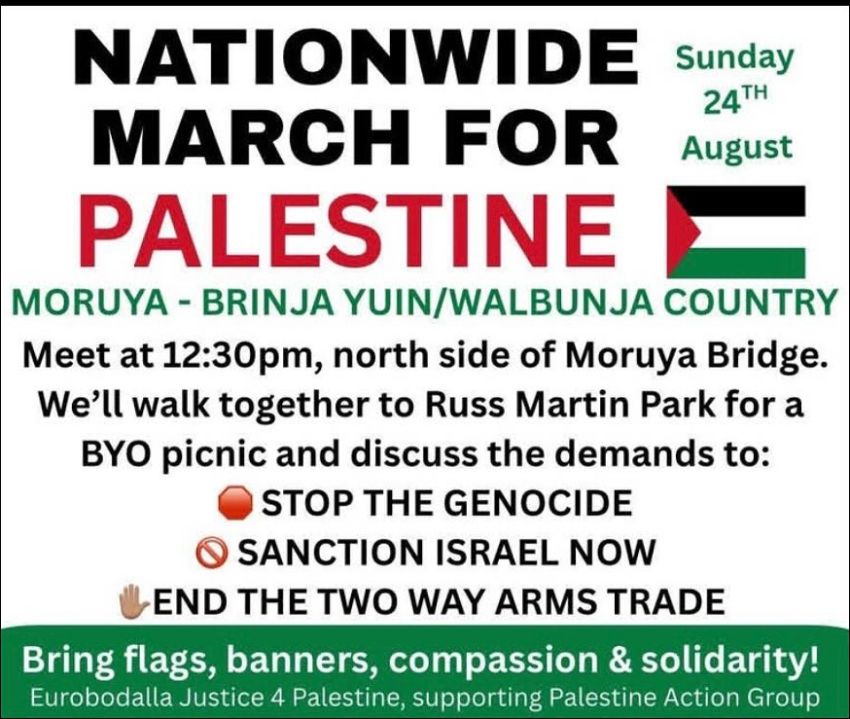 Eurobodalla Justice for Palestine are organising a bridge walk in Moruya on Sunday 24th August to join the nationwide day of action. This is their call out: