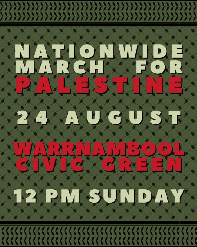 The Nationwide March for Palestine is happening on Sunday 24 August. For those of us from south-west Victoria who can’t make it to Naarm for the march, there will be a family-friendly community event on the Warrnambool Civic Green from midday. More details to come. We hope to see you there.