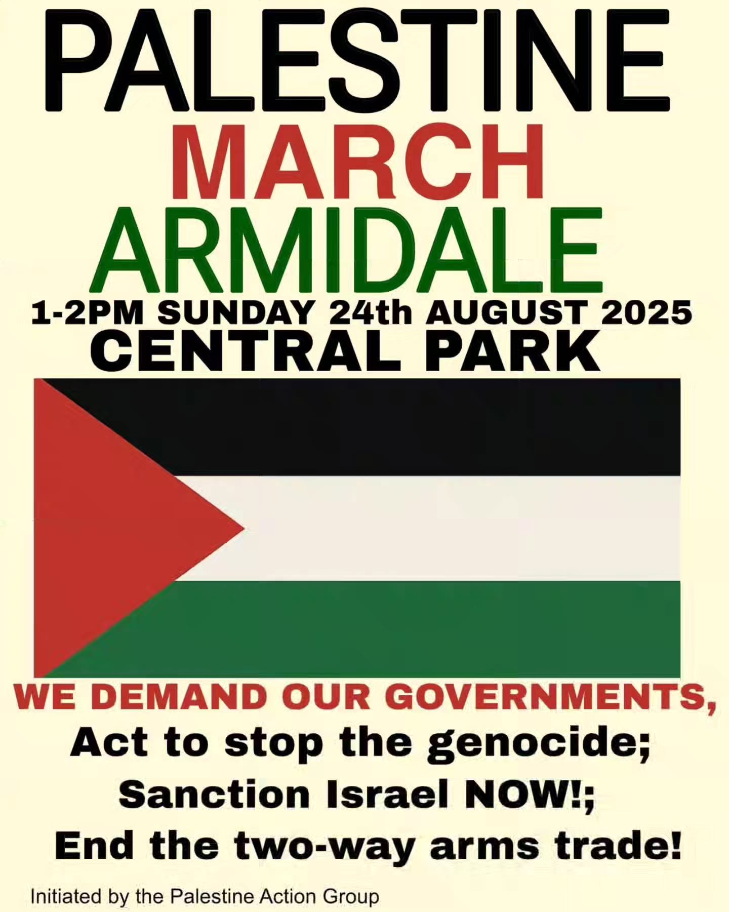 A Form 1 (Intention to hold a Public Gathering) has been lodged, and the event has been registered with Palestine Action Group as part of the nation-wide action following the March for Humanity across the Sydney Harbour Bridge on 3 August 2025.