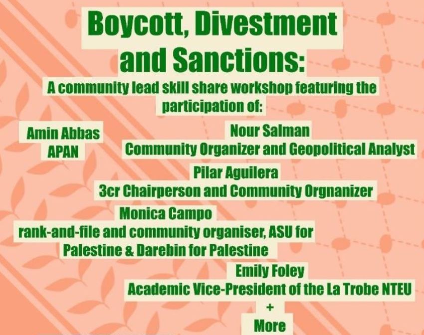 Join experienced organisers from unions, advocacy groups & grassroots movements to learn practical strategies for implementing boycott, divestment & sanctions campaigns in your workplace and community. Come ready to learn, share skills, and leave with concrete next steps.