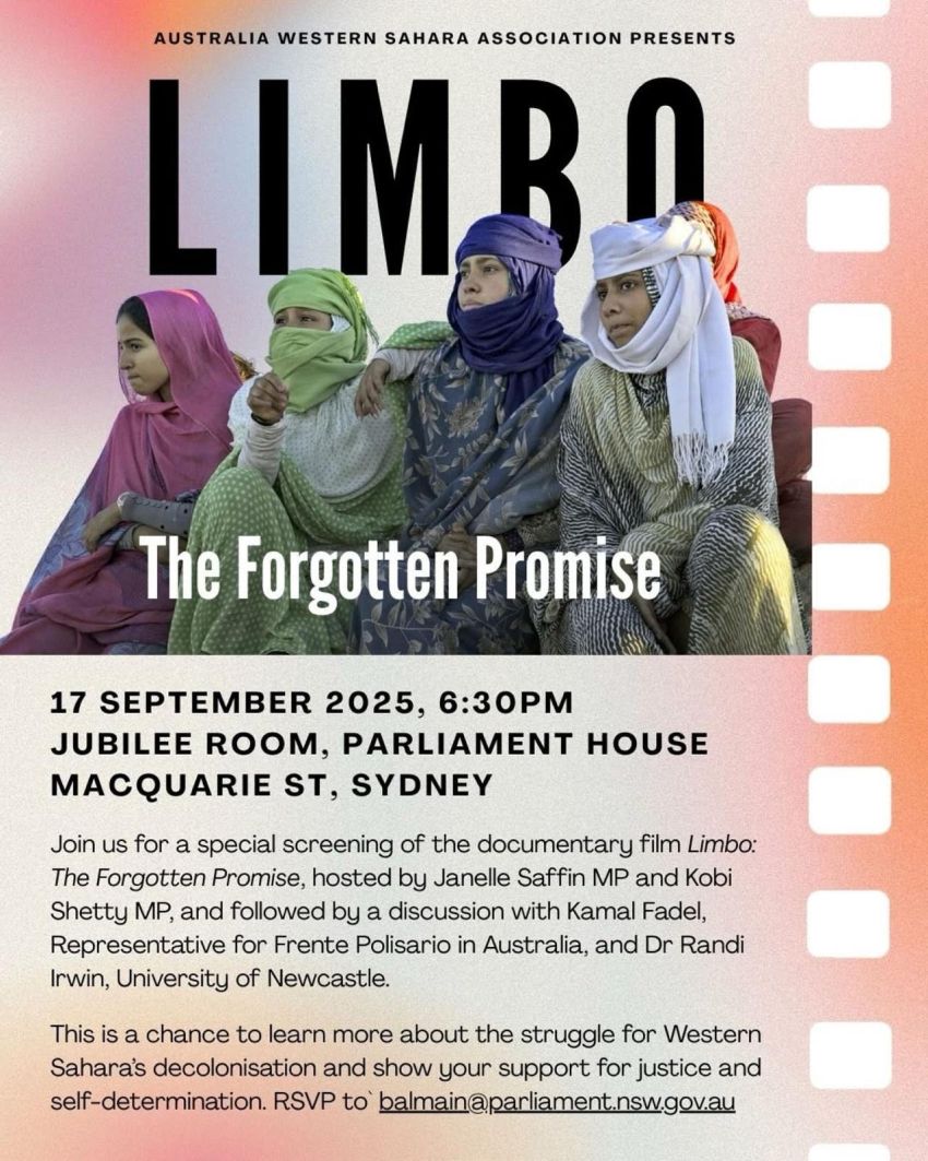 Join us for a special screening of the documentary Limbo – The Forgotten Promise by Antonio Rodrigo. It is hosted by Janelle Saffin MP and Kobi Shetty MP, followed by a discussion with Kamal Fadel, representative of Frente Polisario in Australia, and Dr Randi Irwin, University of Newcastle. This is a chance to learn more about the struggle for Western Sahara for decolonisation and to show your support for justice and self-determination.