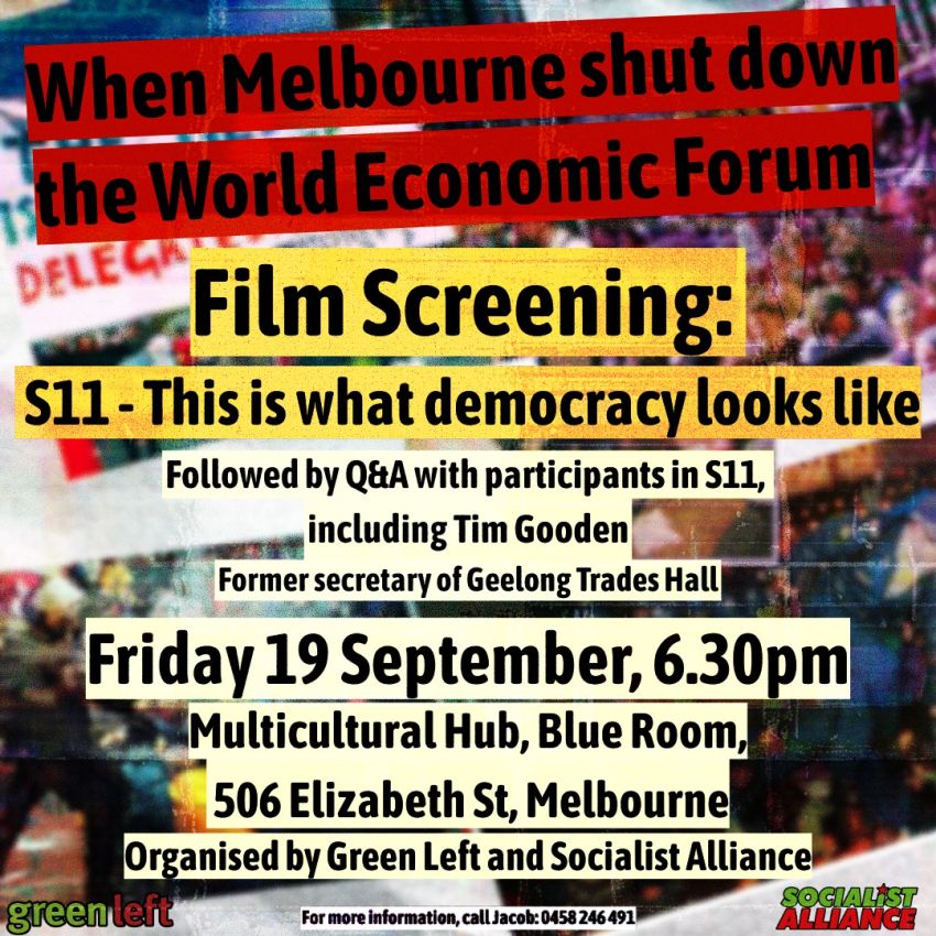 Followed by Q&A with participants in S11 blockade, including Tim Gooden, former secretary of Geelong Trades Hall.