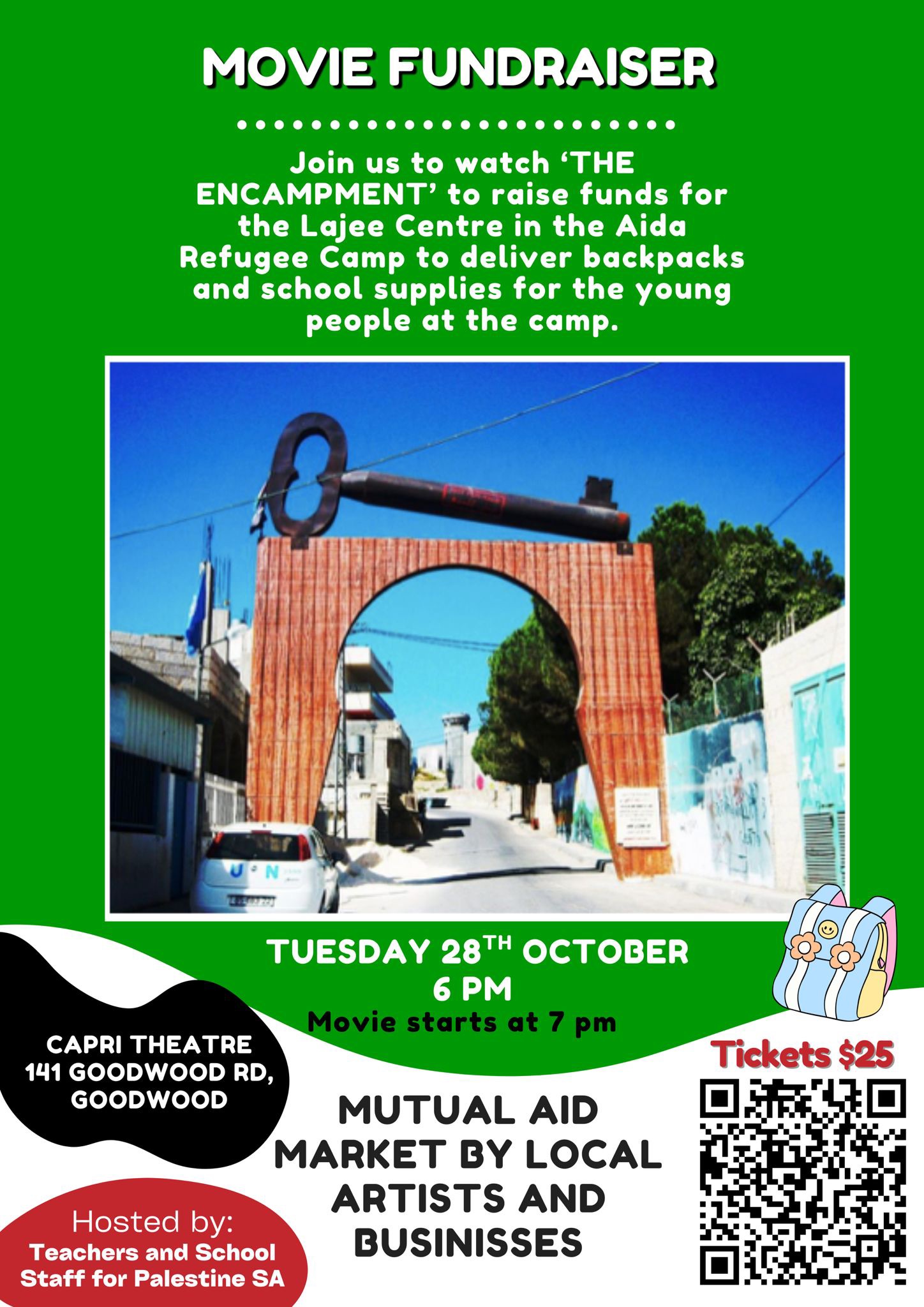 Join us for a powerful screening of The Encampments to raise funds for the Lajee Center in the Aida Refugee Camp, Bethlehem. Proceeds will go directly towards providing backpacks and school supplies for children and young people in the camp.