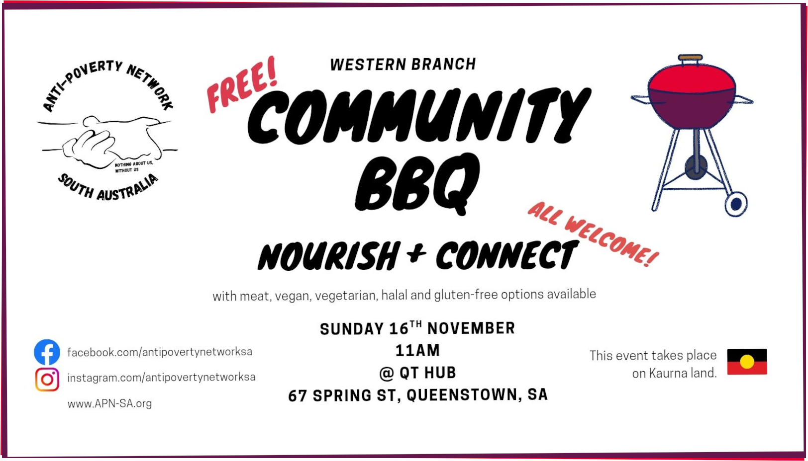 The BBQ takes place on the Traditional lands of the Kaurna people. We pay our respects to Elders past and present, and recognise that sovereignty of this land was never ceded.