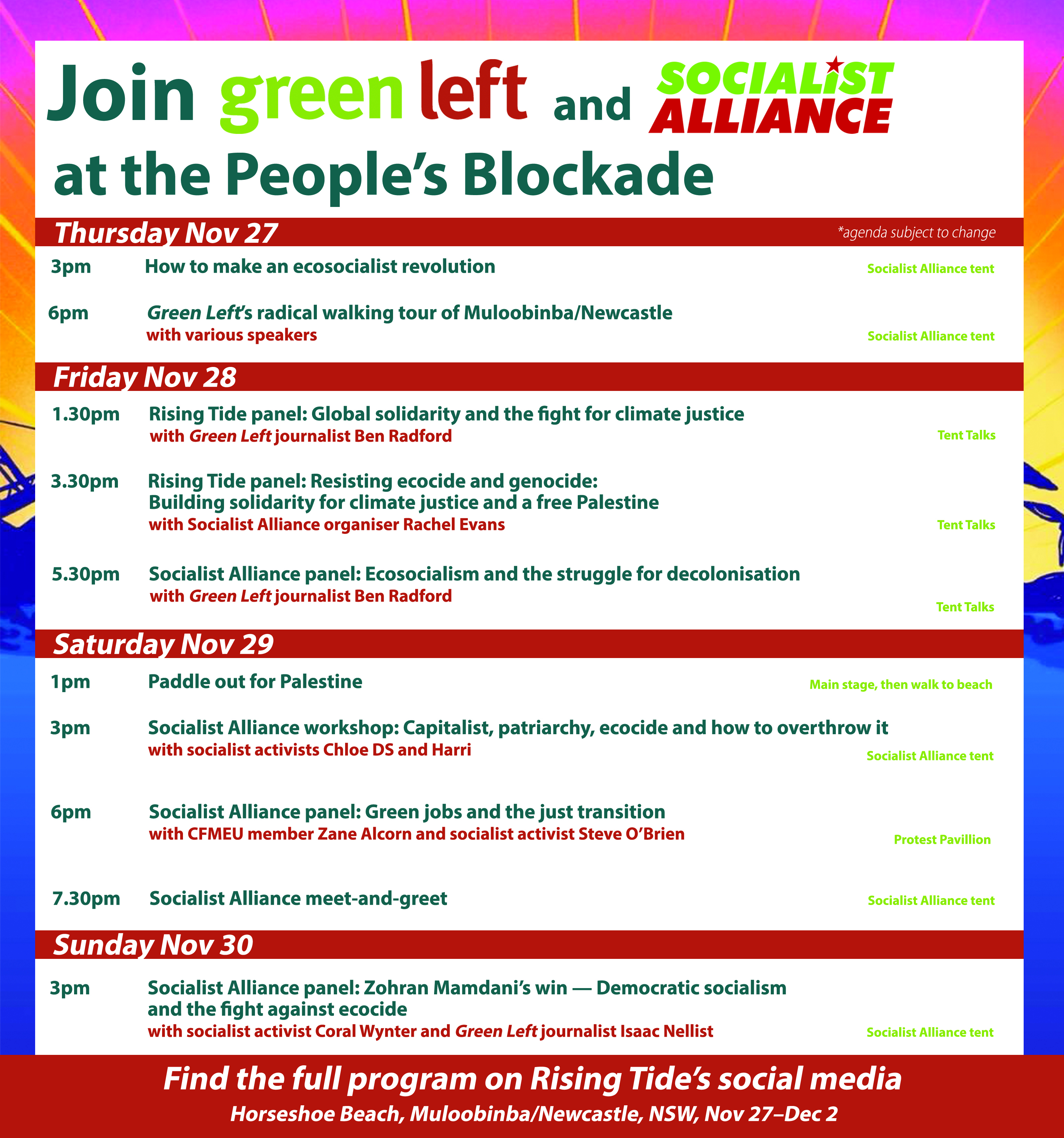 - 3pm: Socialist Alliance panel Zohran Mamdani's win: Democratic socialism and the fight against ecocide – Socialist Alliance tent