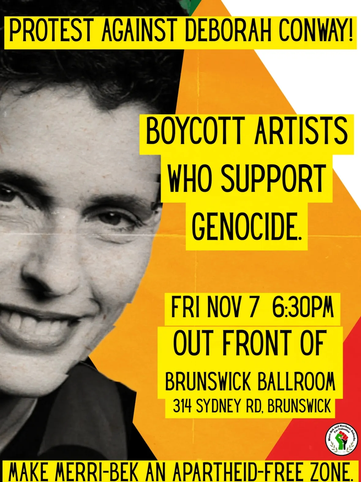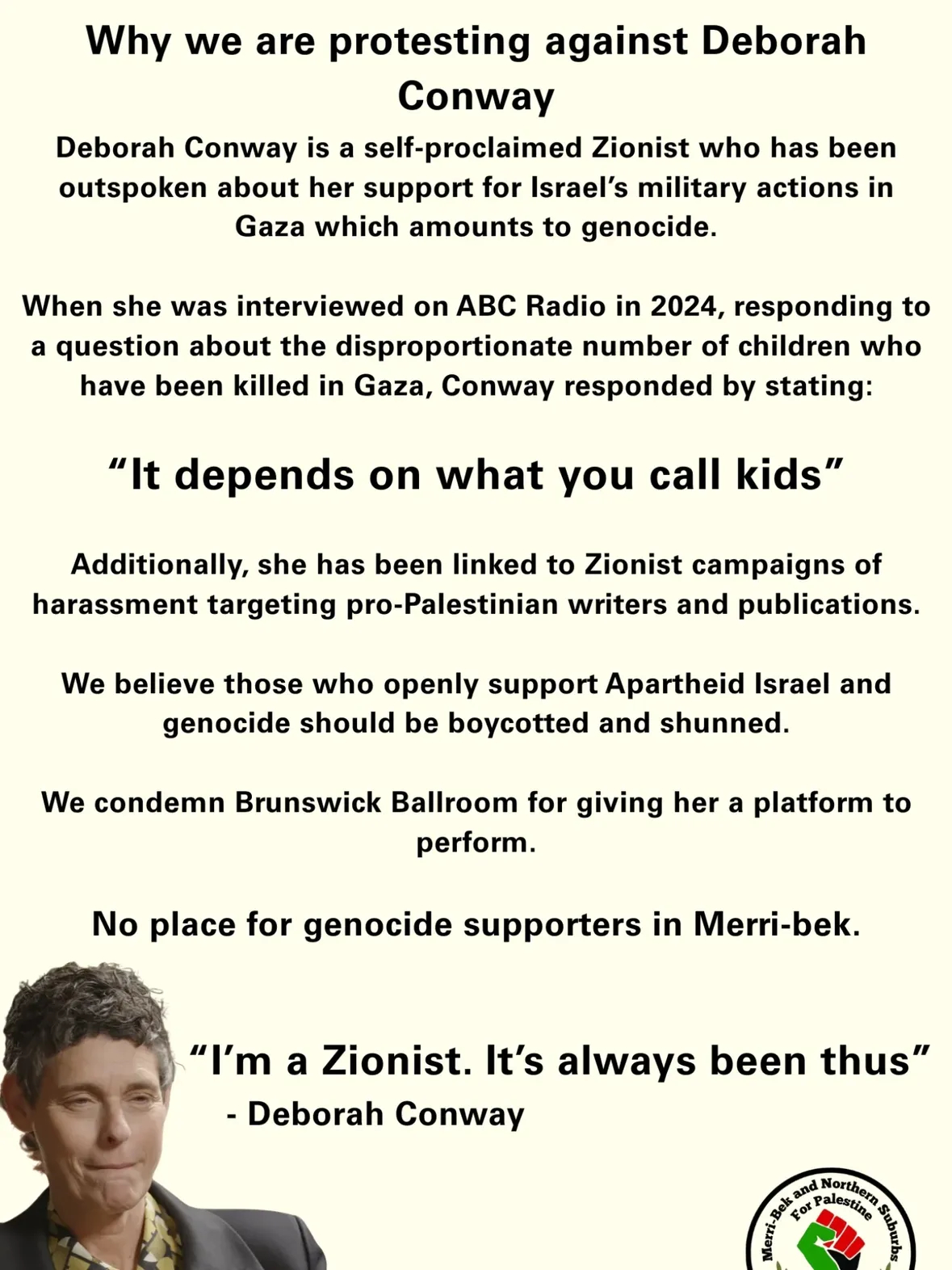 Merri-bek and Northern Suburbs for Palestine has called a protest against Deborah Conway performing at the Brunswick Ballroom on Friday November 7.