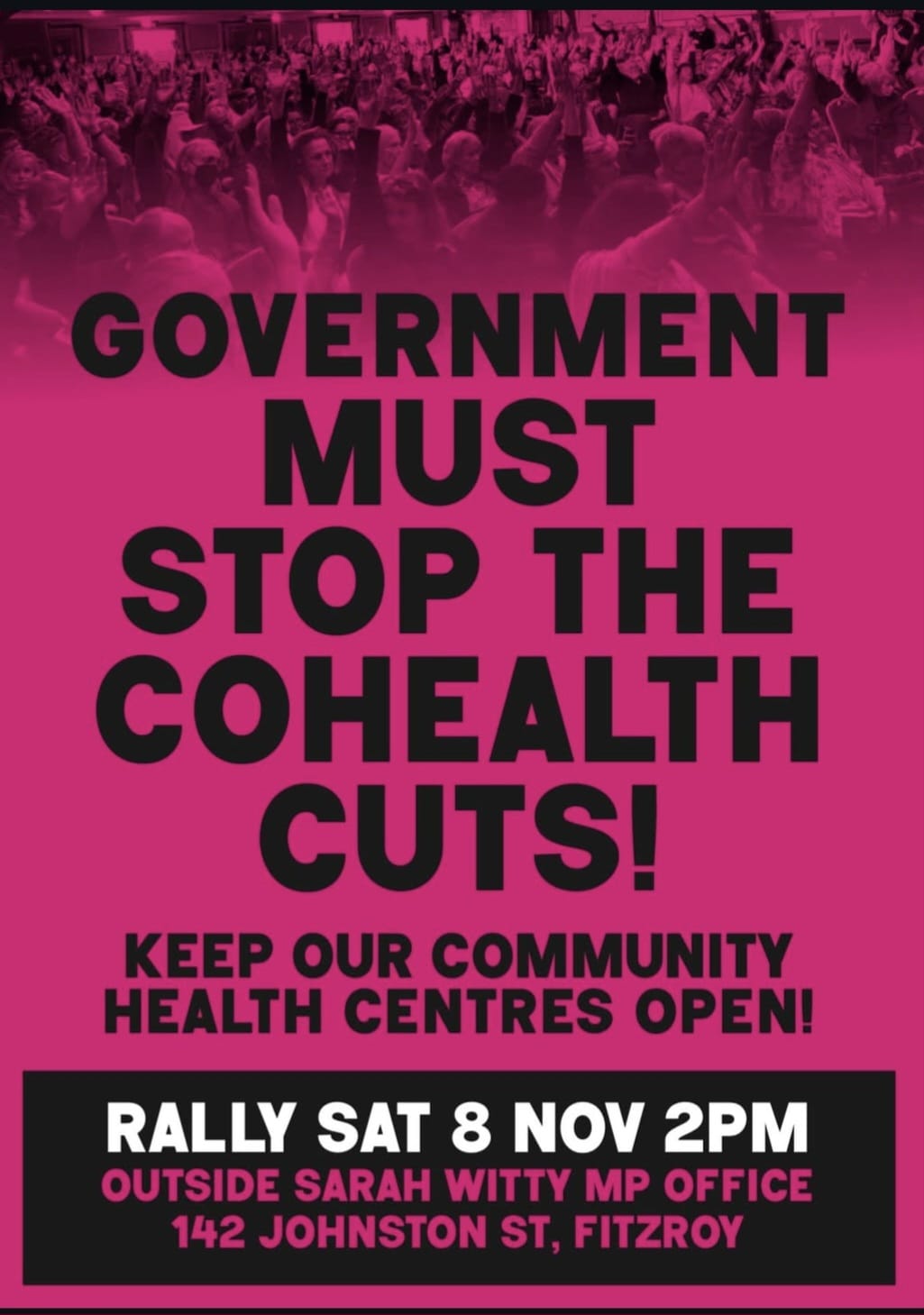 This Saturday, Nov 8 at 2pm outside MP Sarah Witty's office (142 Johnston st, Fitzroy)