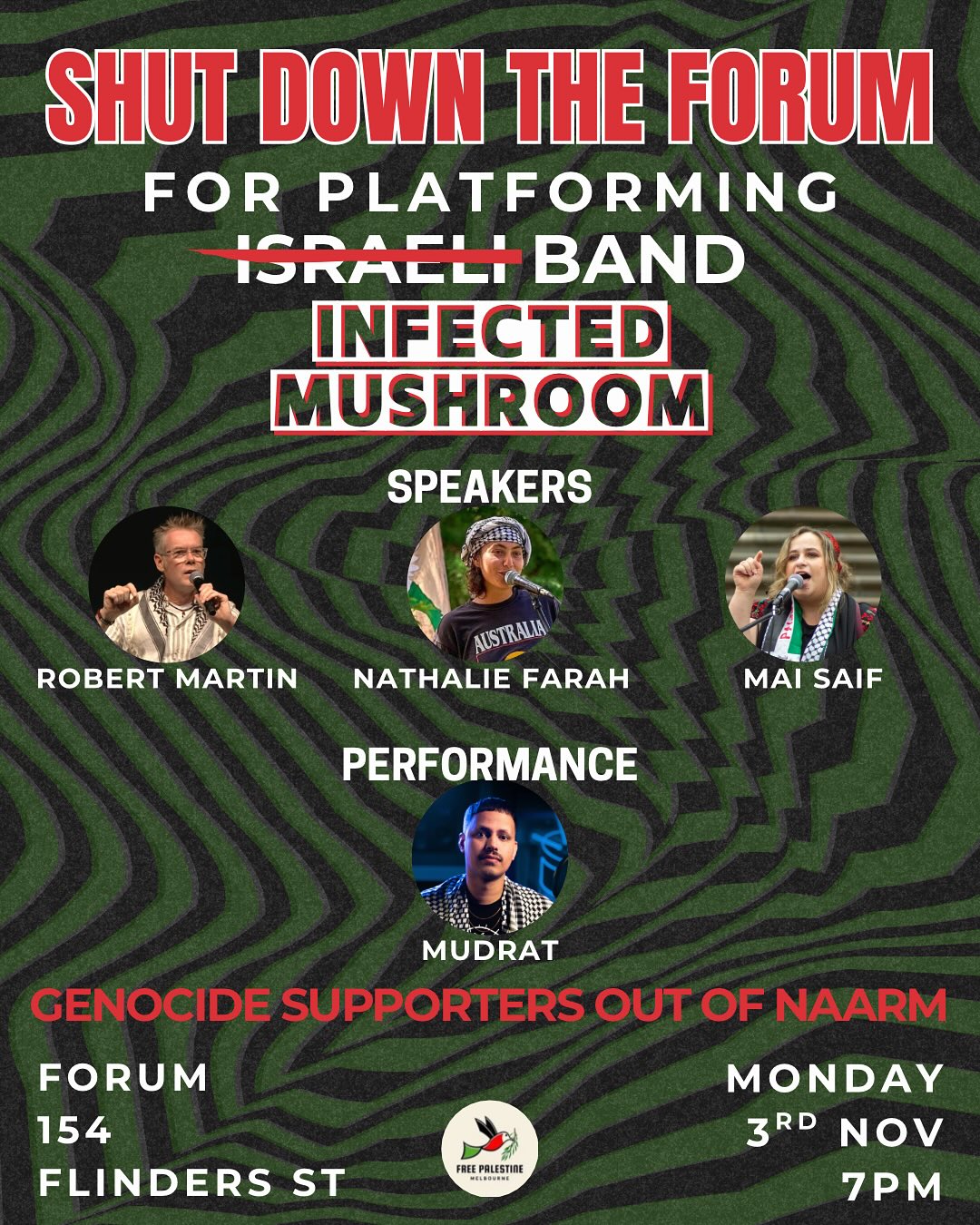 While Israel has NEVER ceased the genocide in Gaza and continues its murderous assault on Palestinians, Forum Melbourne - owned by Marriner Group - thought it would be a good idea to platform a genocide-enabling Israeli band Infected Mushroom in Naarm.