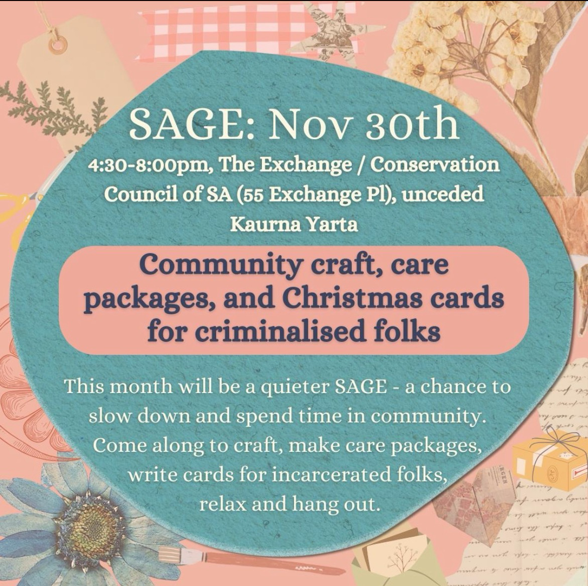 This month will be a quieter SAGE. With many people away interstate at Rising Tide and other big actions, and many others tired and struggling as the year comes to a close, we could all use some rest and care.