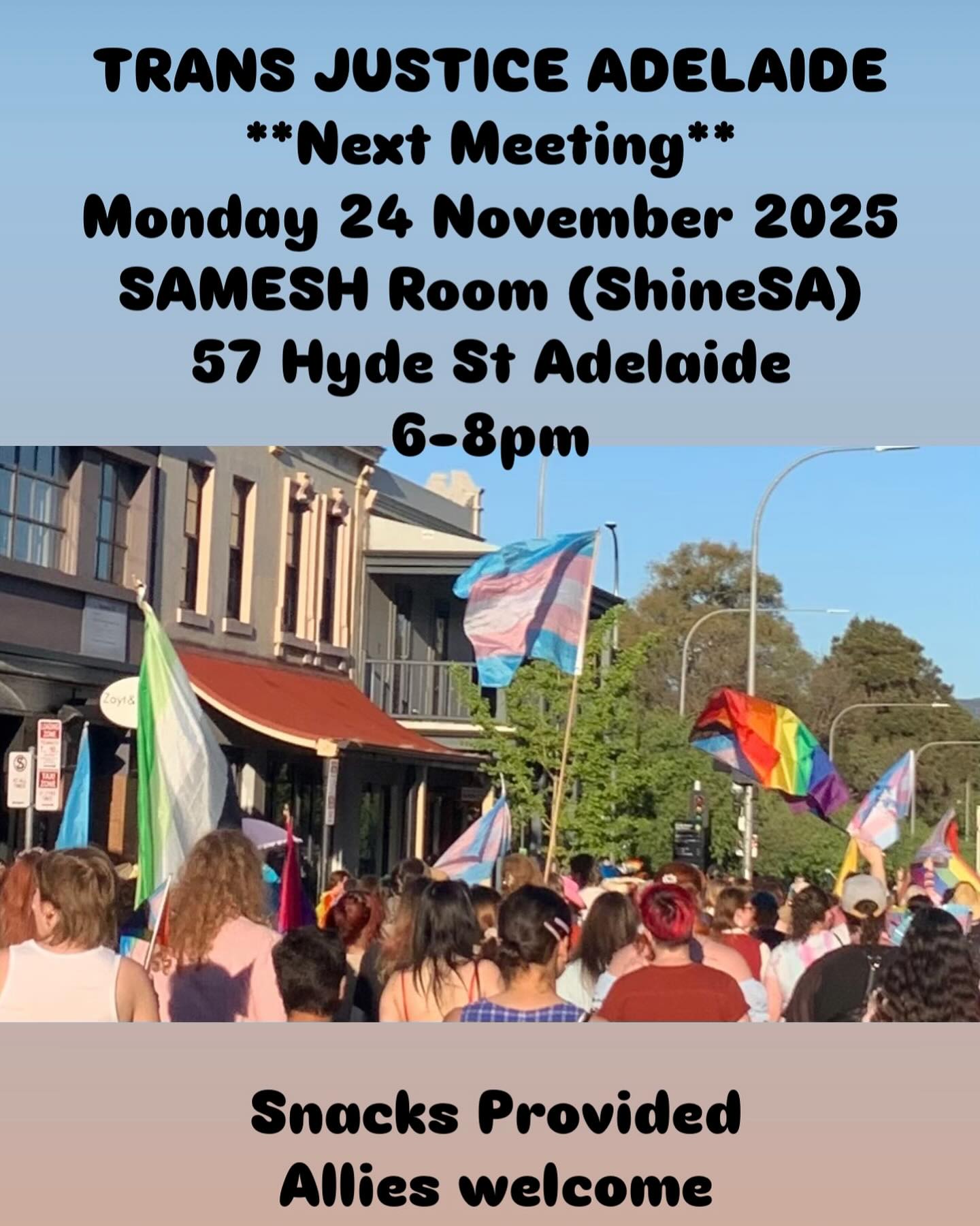 Trans Justice Adelaide Meeting, Monday 24 November 2025, SAMESH Room (ShineSA), 57 Hyde St Adelaide, 6-8pm.