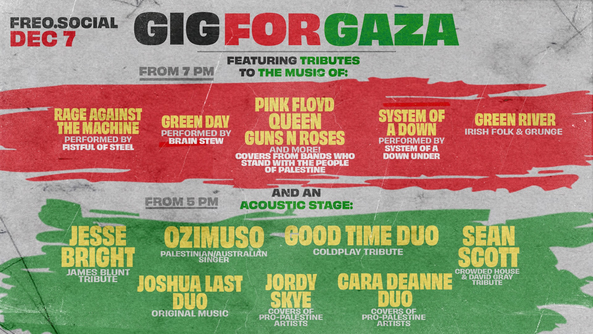 This concert will feature live bands and acoustic artists paying tribute to our heroes in the music industry who have taken a stand against genocide and called for a free Palestine at personal cost: cancelled shows, legal action, cancelled visas, threats. Just because they have chosen to stand up for what they know is morally right. At a time where so much of the music industry has lost its soul, its conscience (and their tongues it would seem).