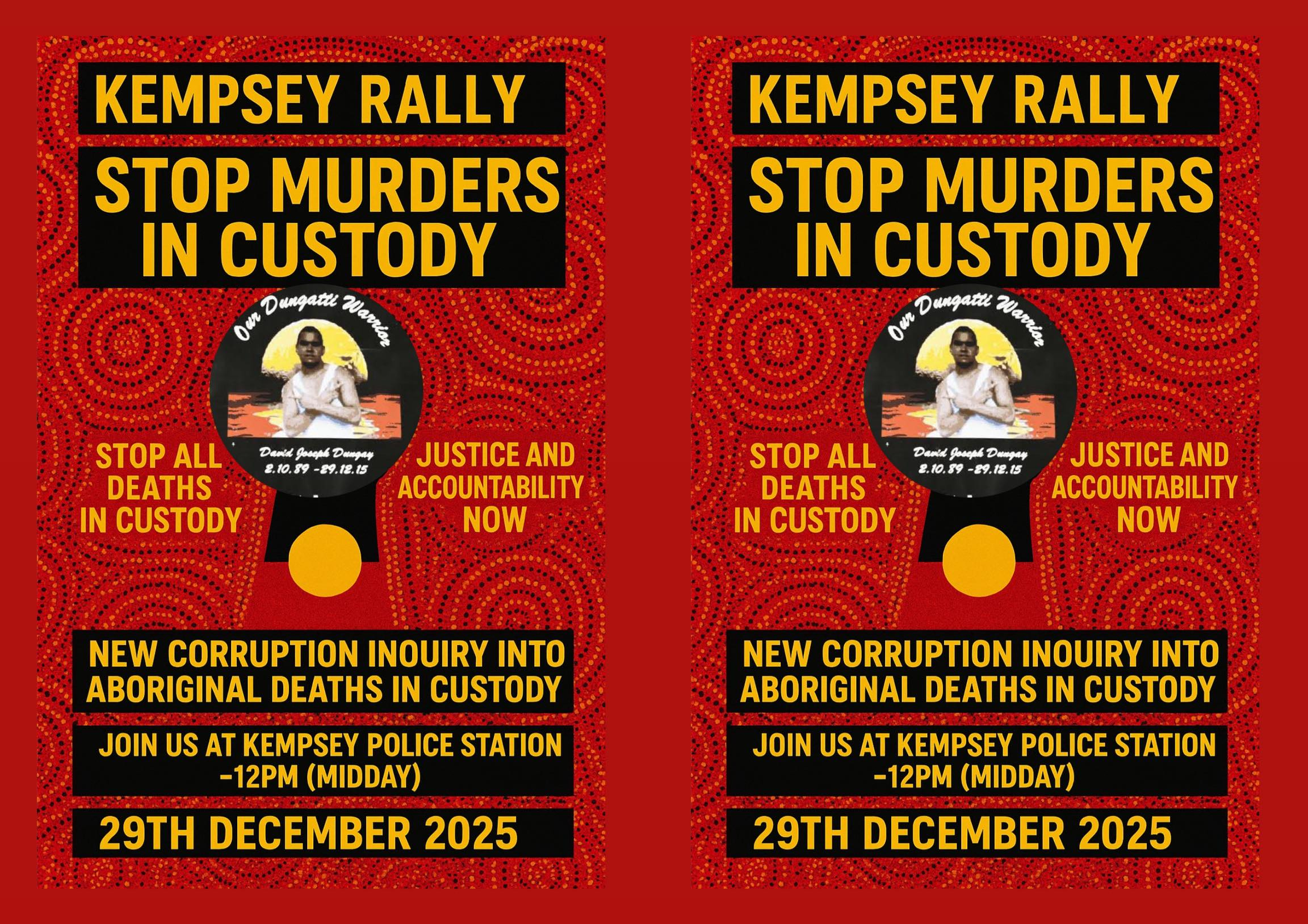 🕊️ A memorial for David Dungay Jnr will be held at Kempsey Jail at 10AM, before the rally begins at 12PM at Kempsey police station — all are welcome to attend, pay respects, and stand in solidarity with his family and community.