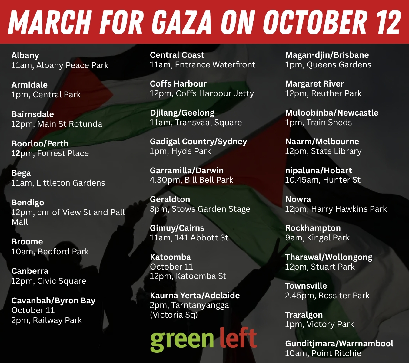National protests on October 12 mark two years of Israel's genocide. They will demand Labor sanctions Israel, ends the two-way arms trade and expels the Israeli ambassador. Get in touch with your local group to help out. Send rally details to @greenleftonline and we'll add them to this list.