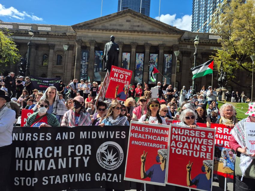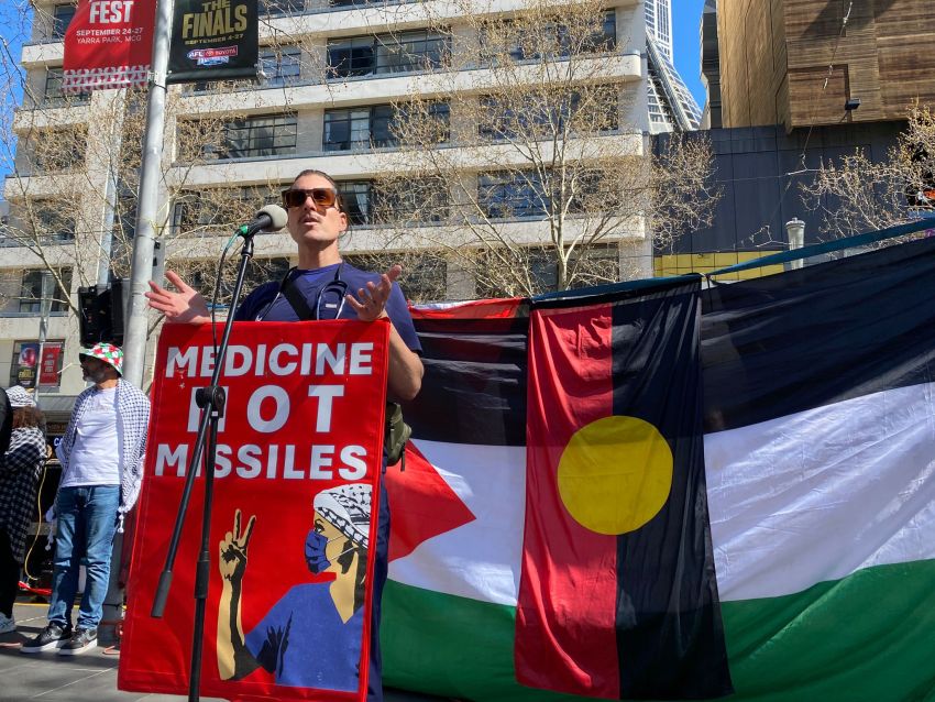 Other speakers included nurse Mat from Australian Nurses and Midwives Victoria for Palestine; Amin G Abbas and Jamal Hakim from Melbourne for Palestine; and musicians Ahmad Atawneh/DJ Matab and Uma Dobia.