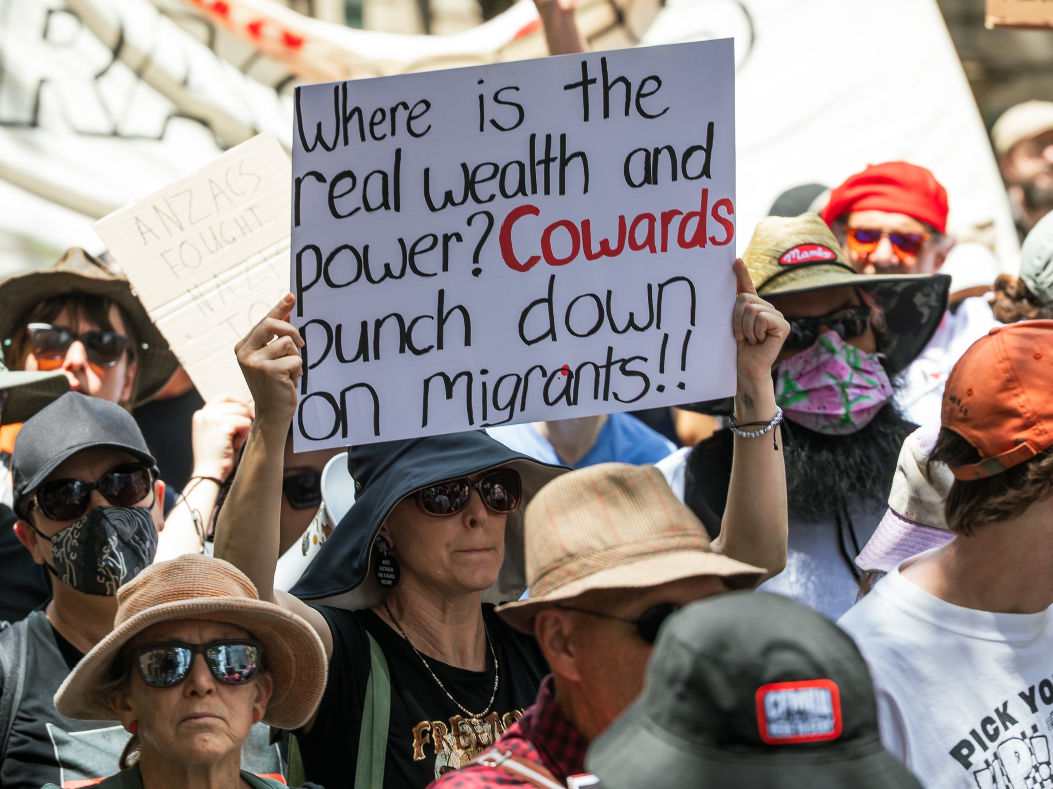 The black-clad and masked members of the neo-Nazi grouplet, the National Socialist Network (NSN), at the front of the MFA marches in the biggest cities in August received most public attention. And after NSN thugs attacked Camp Sovereignty, a sacred place maintained by Aboriginal people in Naarm/Melbourne, and other reports of abuse and assaults on people in public transport, the outrage and publicity led to NSN’s leader, Thomas Sewell, and two others being arrested on multiple charges.