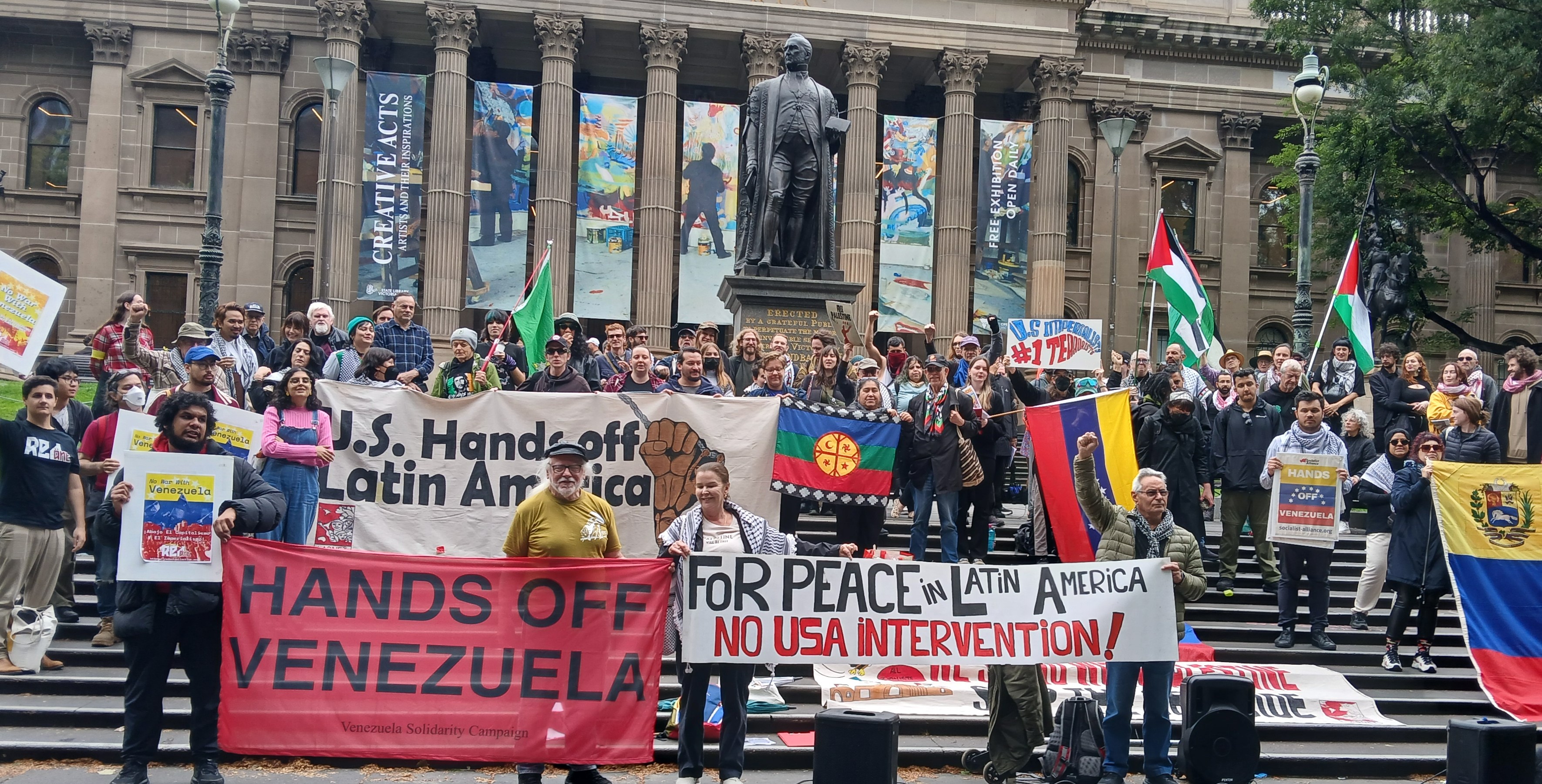 Protesters condemned the United States’ threats to Latin America, particularly Venezuela and Colombia, outside the State Library on November 23.